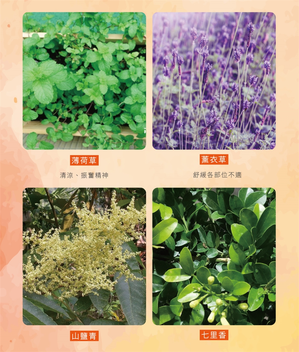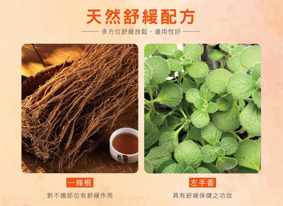 全 成 份:一條根(闊葉大豆)、山鹽青葉、七里香葉、左手香、薰衣草、薄荷葉萃取、樹脂。