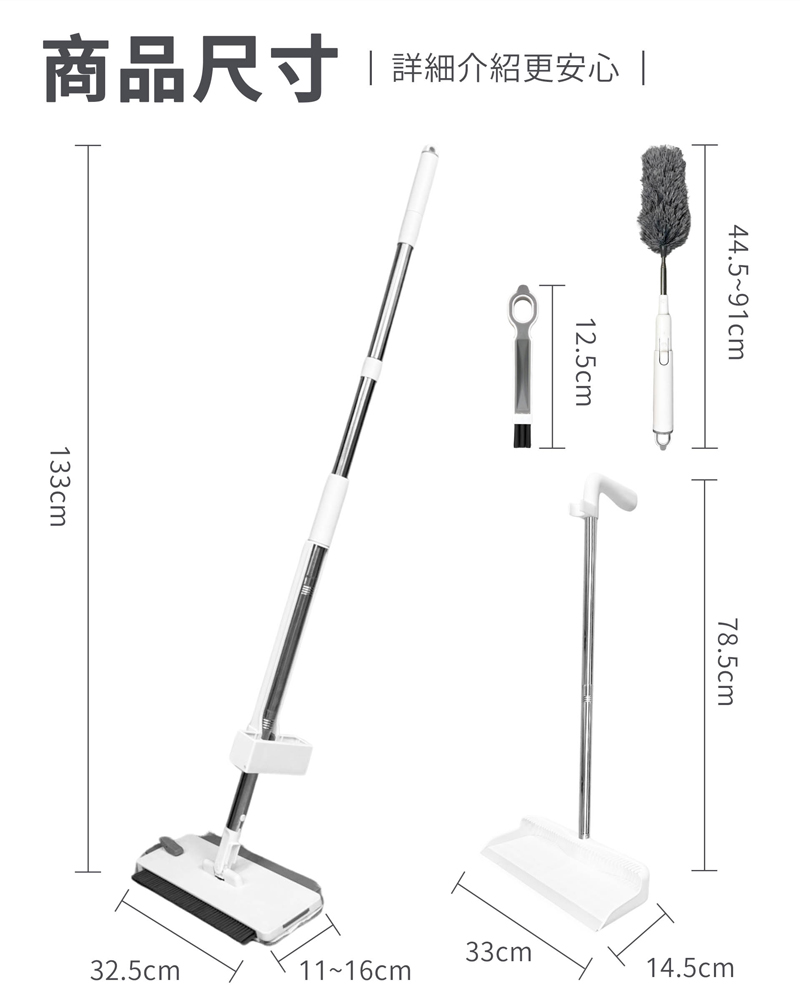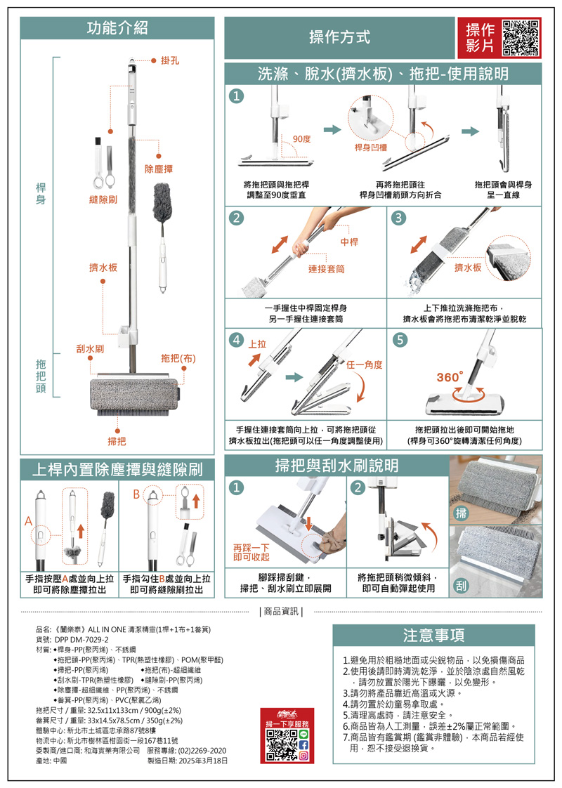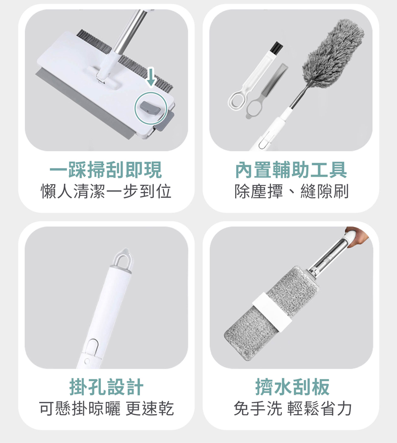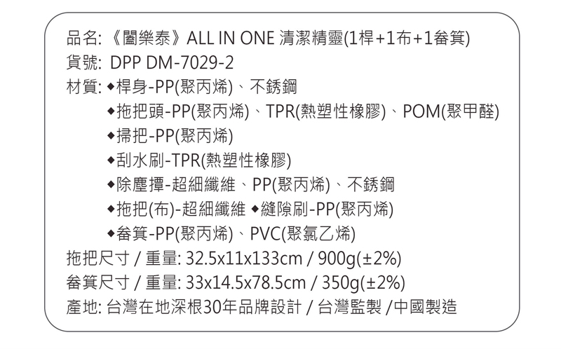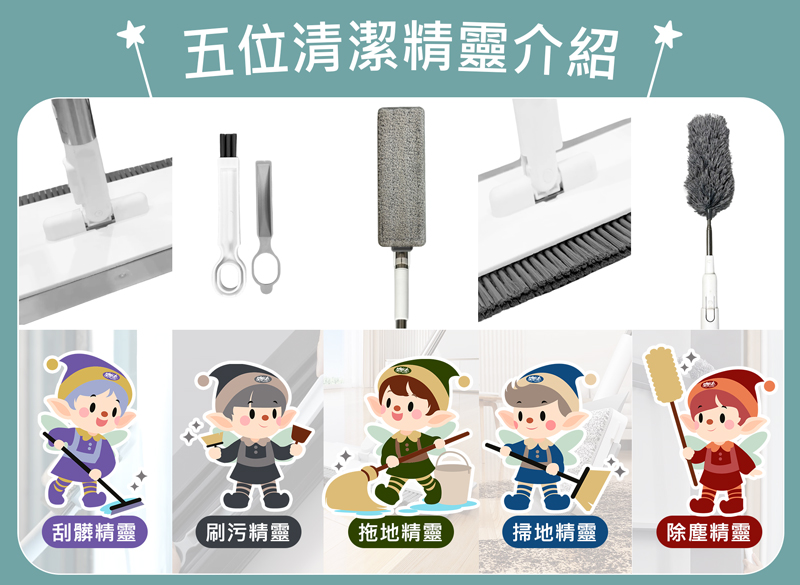 掃把-PP(聚丙烯) / 拖把布-超細纖維 / 刮水刷-TPR(熱塑性橡膠) / 除塵撢-超細纖維、PP(聚丙烯)、不銹鋼 / 縫隙刷-PP(聚丙烯)