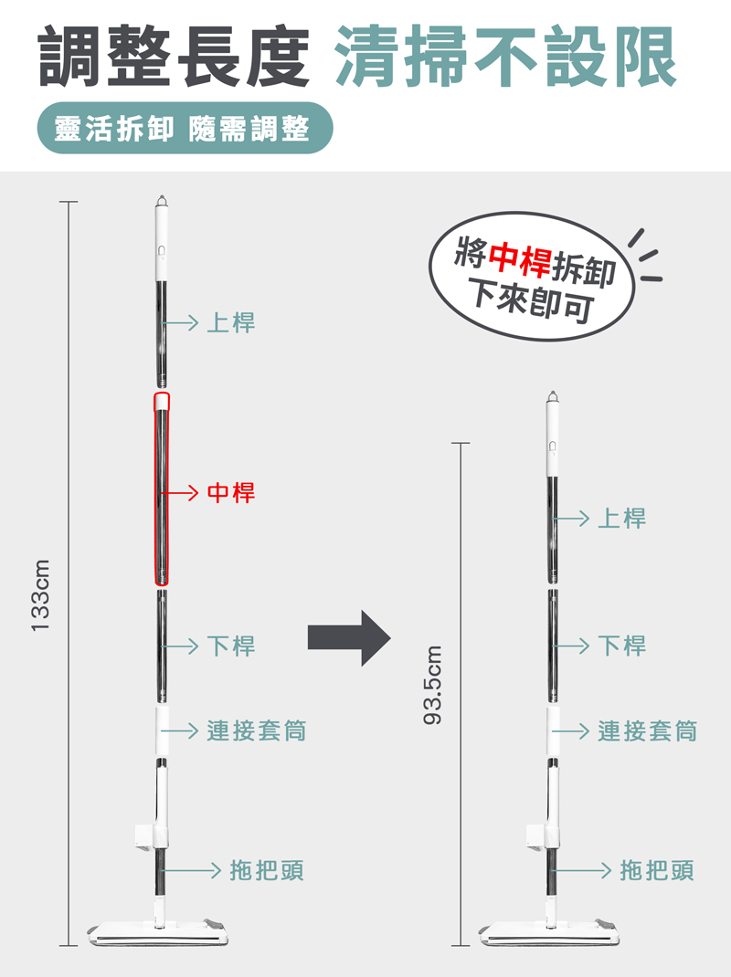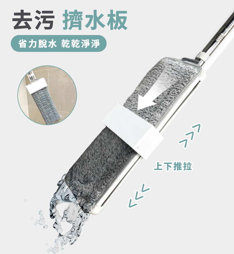 桿身-PP(聚丙烯)、不銹鋼 / 拖把頭-PP(聚丙烯)、TPR(熱塑性橡膠)、POM(聚甲酸醛)