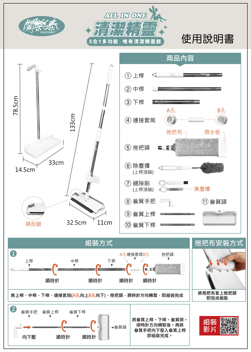 《闔樂泰》ALL IN ONE 清潔精靈(五合一多功能 )體驗組-1桿1布 贈畚箕(10401423)