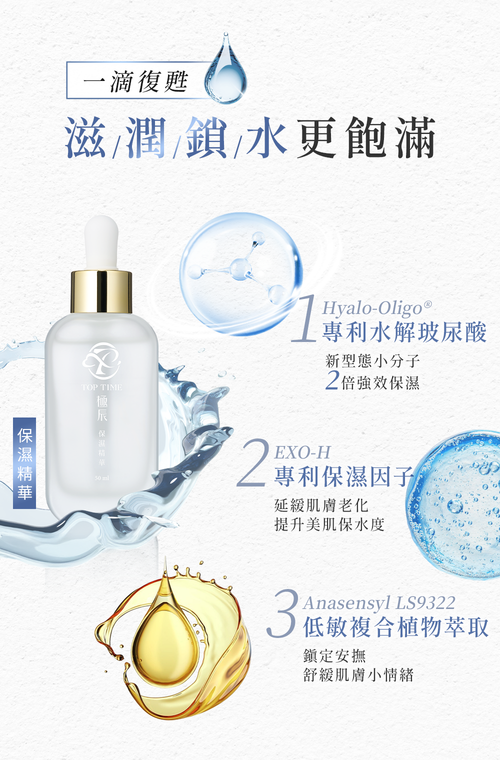 主要成分:Anasensyl LS9322【抗敏複合植物萃取】、Tridermol Hydrant 【愛爾蘭海藻玻尿酸】、EXO-H【保濕因子】、Hyalo-Oligo Hydrolyzed Hyaluronic Acid【水解玻尿酸】、Sodium Hyaluronate【玻尿酸鈉】、X-Pressin C【木瓜酵素】、Dipotassium Glycyrrhizate【甘草酸二鉀】