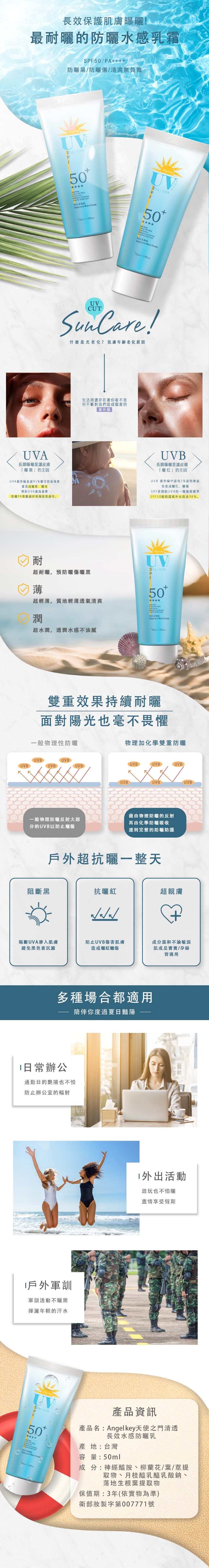 產地:台灣製 使用方法:取適量水感防曬乳,於保養最後一道做肌膚防護,輕柔的塗抹於臉/身體部位;長期曝曬於陽光下,建議每隔2-3小時補抹一次。
