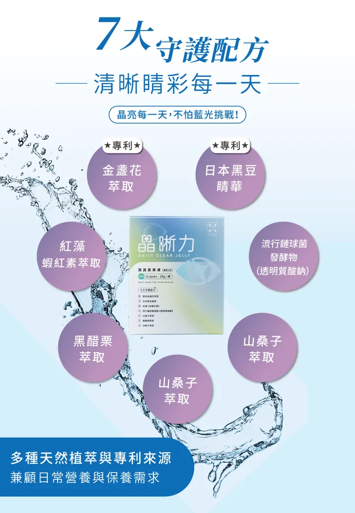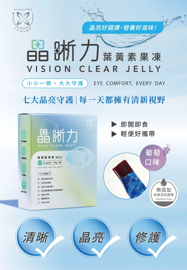 晶晰力 葉黃素果凍(15入) 成分:水、葡萄濃縮汁、枸杞萃取物、決明子粉、洋菜粉、蒟蒻葡甘露聚醣、刺槐豆膠、玉米糖膠、鹿角菜膠、氯化鉀、果糖粉、金盞花萃取物(含葉黃素、玉米黃素)、山桑子萃取物、蘋果酸、紅藻萃取物(含蝦紅素)、黑豆皮抽出物、黑醋栗萃取物、流行鏈球菌發酵物(含透明質酸鈉)、檸檬酸鈉、蔗糖素(甜味劑)