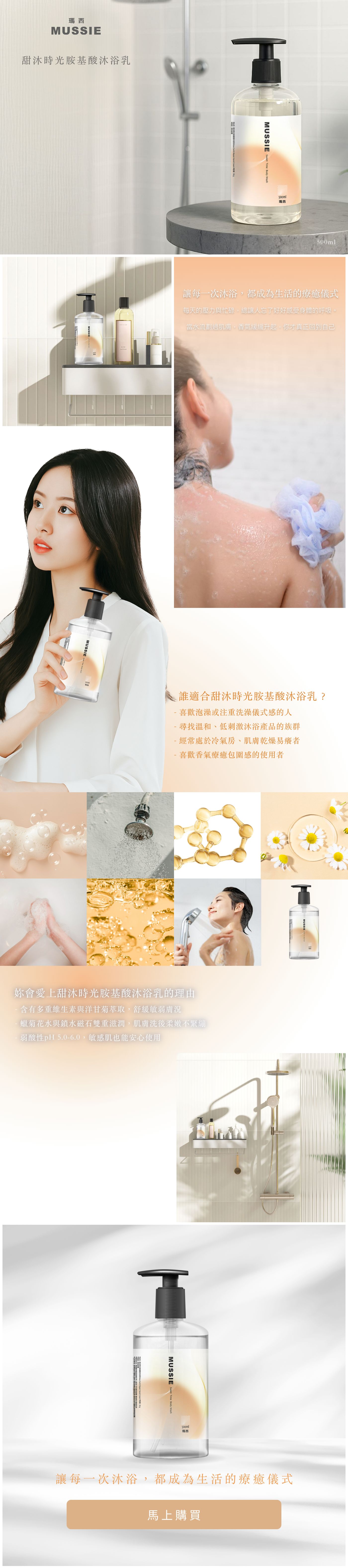 使用說明:甜沐時光胺基酸沐浴乳是一款多重功效的沐浴產品,提供了溫和清潔、保濕調理和滋潤的功能,同時具有弱酸性,不刺激皮膚。不論您的皮膚類型如何,這款沐浴乳都能滿足您的需求,為您帶來柔軟、水潤的肌膚。如果您有任何疑問或需要更多信息,請隨時聯繫我們的消費者服務專線。