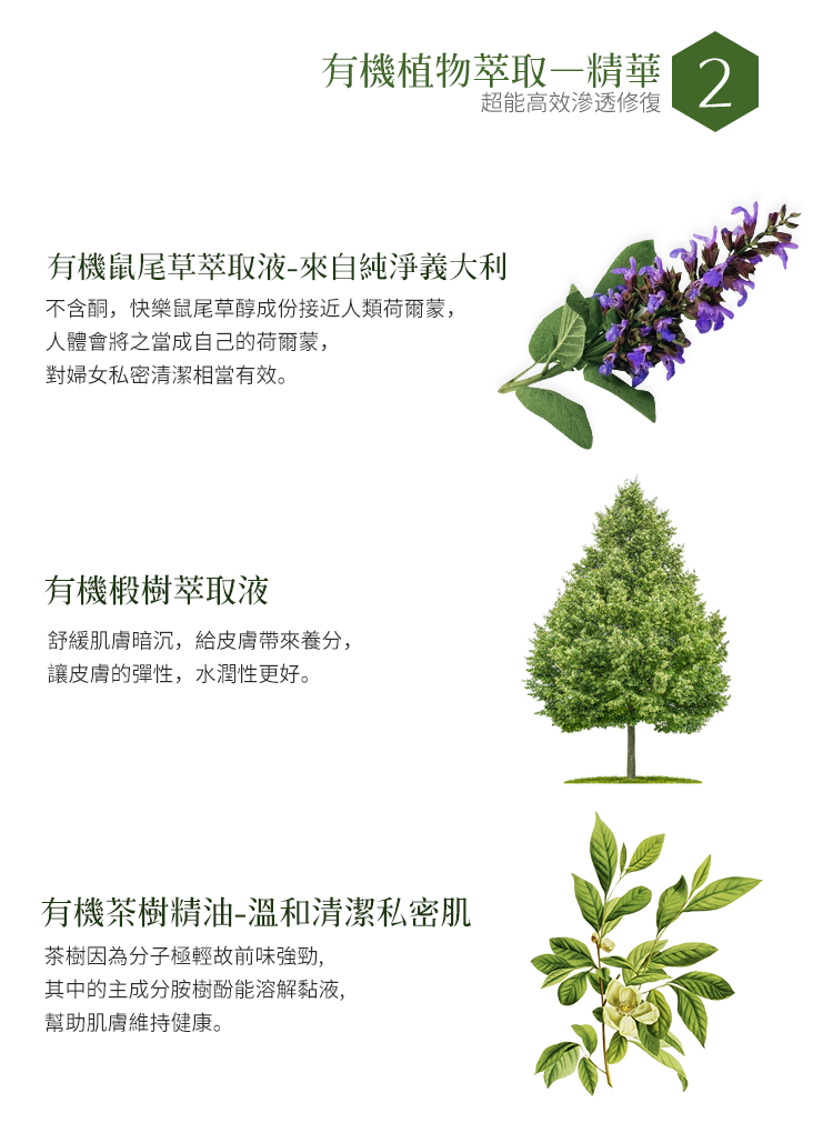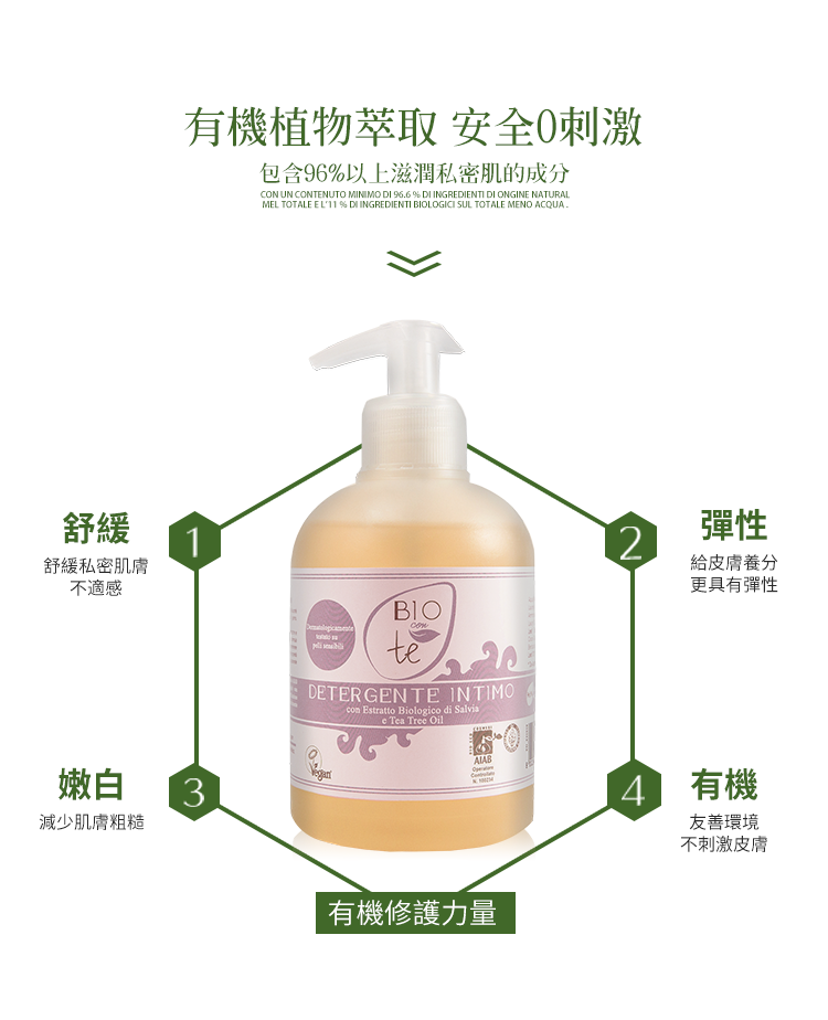 義大利植萃有機專家BIOCONTE,贏得多項認證:ICEA 友善環境產品認證、AlAB 義大利有機農業組織認證、VEGAN 英國素食協會等等,堅持全系列「有機無毒」「溫和低敏」「植物性精華」「無動物實驗」,專為敏感肌開發四大有機修護力量,96%植物成份+13%有機成份,有機鼠尾草降菌淨味,保持私密菌種平衡,舒緩癢央,茶樹弱酸平衡配方:溫和+防護+滋潤,,私密重回舒適、緊緻、嫩白、無味。 |