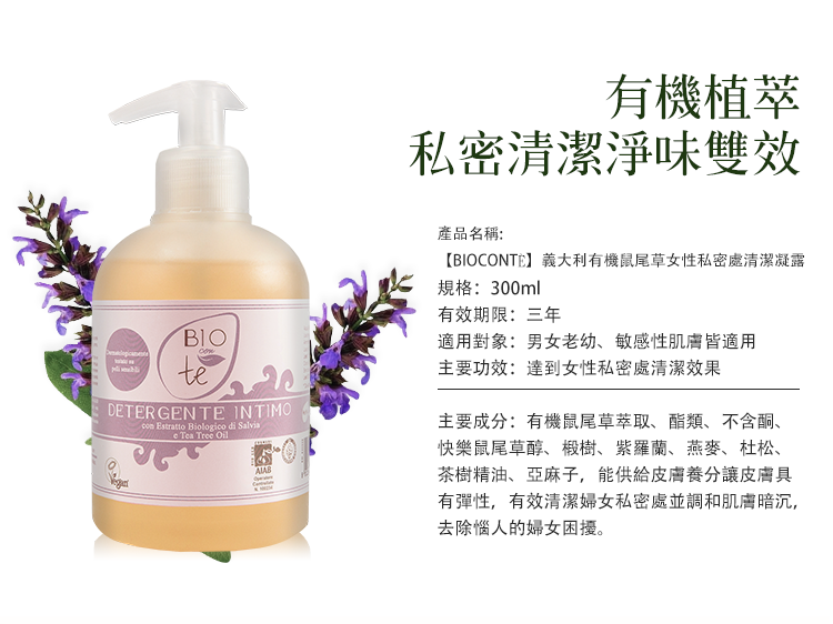 品牌:BIOCONTE 品名:有機鼠尾草女性私密處清潔凝露 容量:300ml |