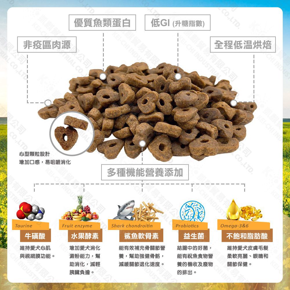 ●主要成分:澳洲雞肉、澳洲羊肉、海洋魚類蛋白(鮭魚、鱈魚、鯖魚、鱒魚、鯷魚) 。 澱粉(番薯、馬鈴薯、南瓜)、豌豆、田園蔬果(山藥、番茄、胡蘿蔔、百合、蘑菇、蘋果、藍莓、鳳梨、小紅莓、荷蘭芹、西蘭花)、亞麻籽(Omega 3來源)、香料、甜菜纖維、綠茶萃取物、絲蘭萃取物、活性酵母。 雞脂(以維生素E、維生素C混合作為天然保鮮原料)、鮭魚油(DHA、EPA、Omega 3來源) 。 亞麻油酸、牛磺酸、蛋胺酸、胱胺酸、卵磷脂、葡萄糖胺、鯊魚軟骨素、磷酸鈉、泛酸鈣、胺基酸螯合鐵、胺基酸螯合鋅、胺基酸螯合銅、胺基酸螯合錳、維生素A、維生素E、維生素D3、維生素C、維生素K、維生素B1、維生素B2、鳳梨酵素、澱粉分解酵素、脂肪分解酵素、益生菌(乳酸桿菌、乳酸腸球菌)。
