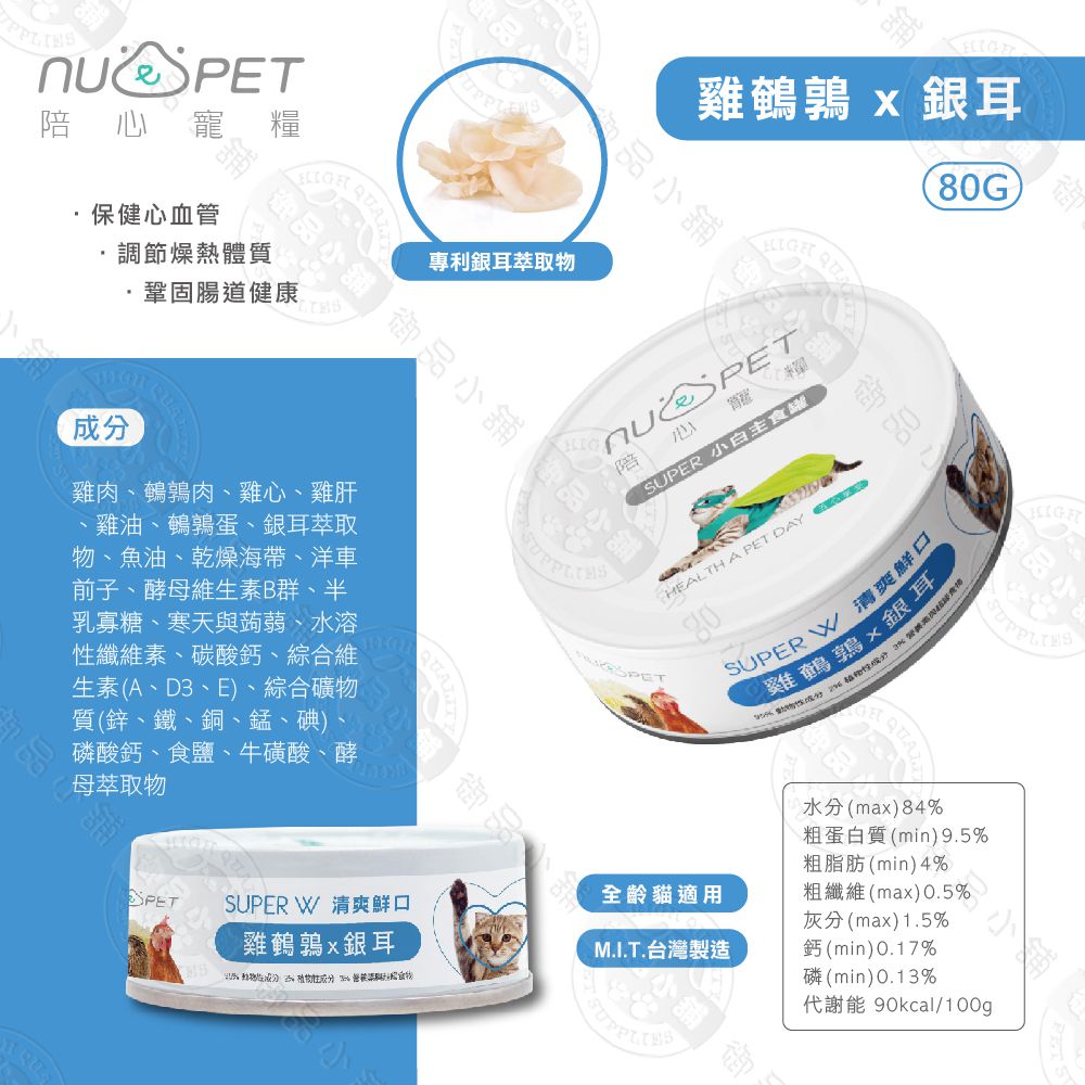 ●成本:雞肉、鵪鶉肉、雞心、雞肝、雞油、鵪鶉蛋、銀耳萃取物、魚油、乾燥海帶、洋車前子、酵母維生素B群、半乳寡糖、寒天與蒟蒻、水溶性纖維素、碳酸鈣、綜合維生素(A、D3、E)、綜合礦物質(鋅、鐵、銅、錳、碘)、磷酸鈣、食鹽、牛磺酸、酵母萃取物