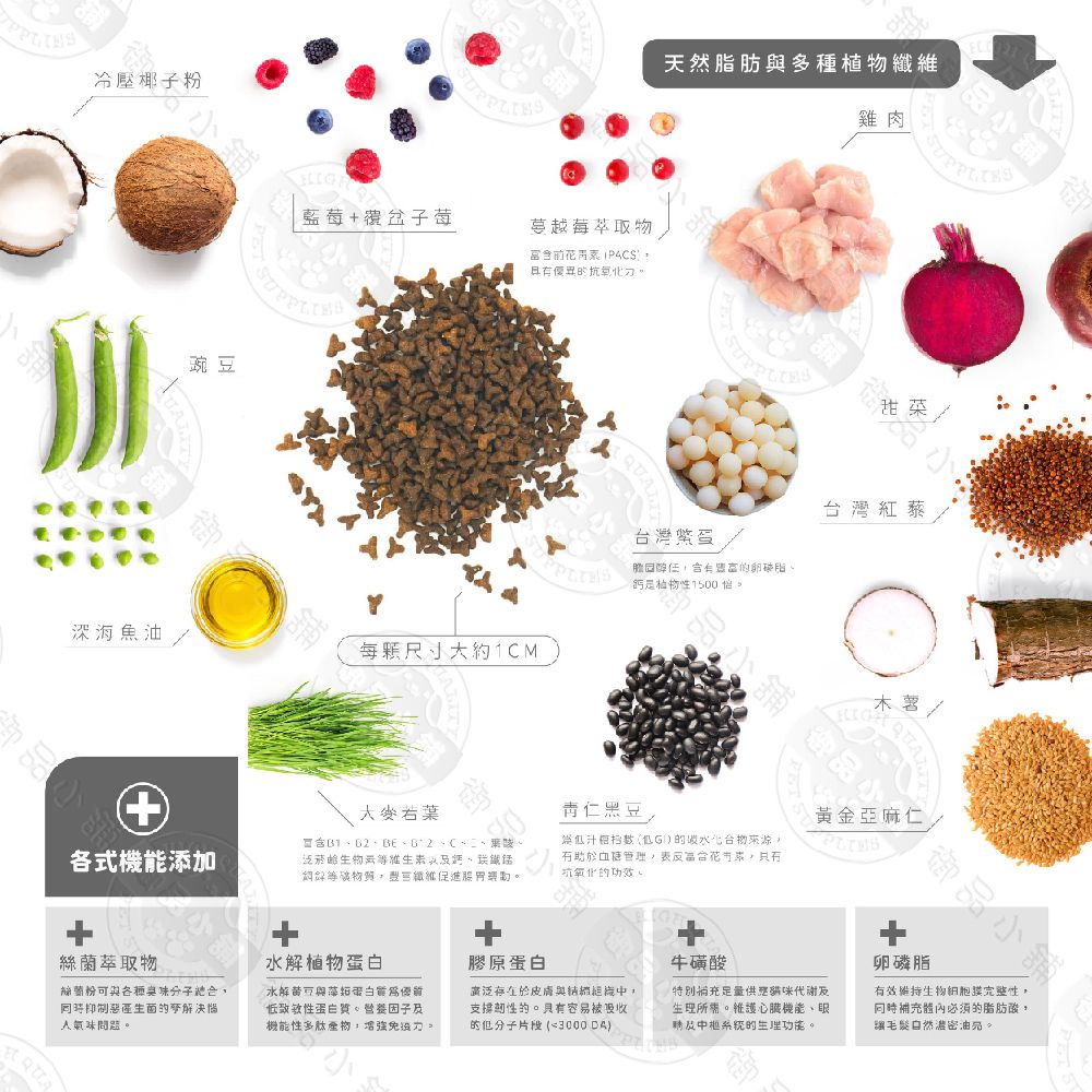 澳洲雞肉粉、水解植物蛋白、雞肉水解蛋白、糖蜜酵母、木薯、黃金亞麻仁籽、冷壓椰子粉、雞油、深海魚油(OMEGA-3、OMEGA-6來源)、絲蘭萃取物、甜菜、苜蓿、蔓越莓、藍莓、草莓、覆盆子莓、乾燥蛋黃、青仁黑豆、豌豆、大麥若葉、台灣紅藜、保健機能粉(鱉蛋粉、膠原蛋白)、腸道保健益生菌、蔓越莓萃取物、卵磷脂、維生素(A、D、E、K、1(硫胺素)、B2(核黃素)、B6(吡哆素)、B12(鈷胺素)、葉酸、泛酸、菸鹼酸、生物素)、礦物質(硫酸鋅、硫酸銅、硫酸錳、硫酸鐵、碳酸鈷、碘化鉀)、牛磺酸、氣化膽鹼、DL-蛋胺酸、離胺酸