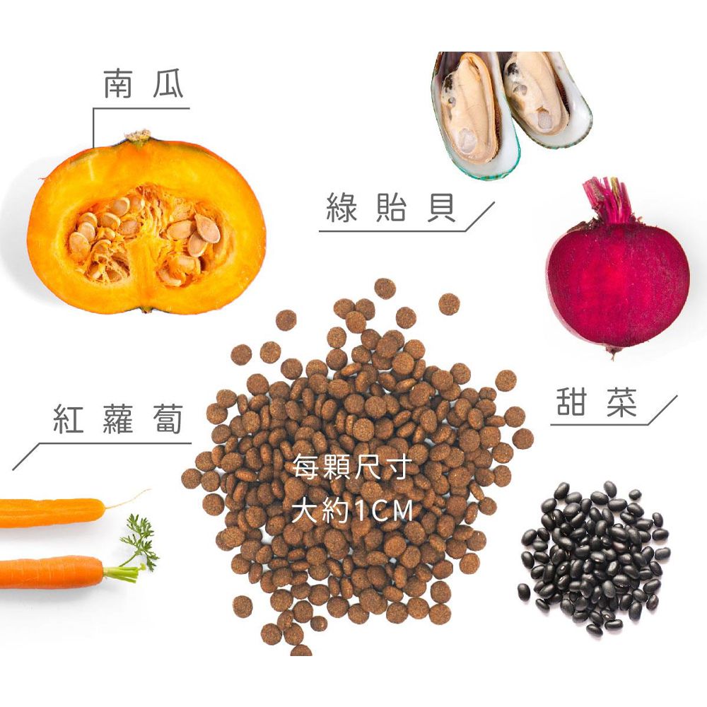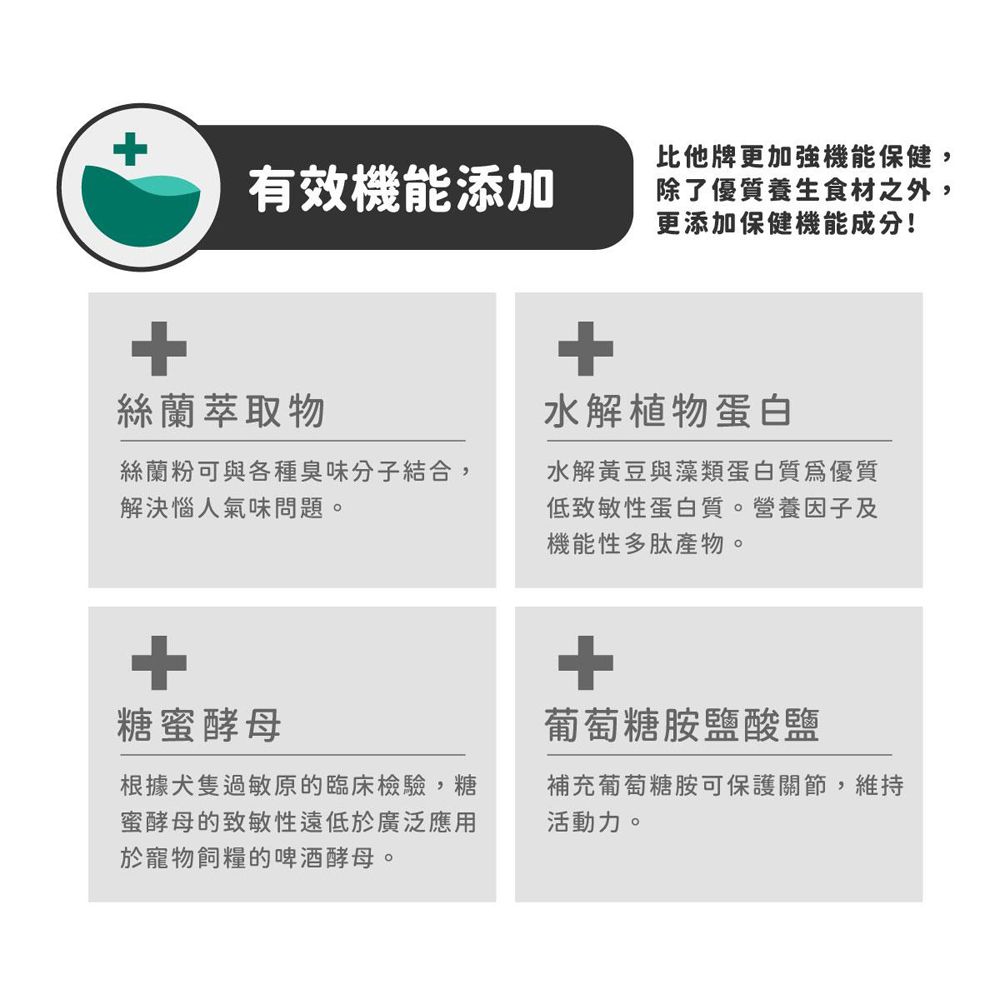 澳洲雞肉粉、水解植物蛋白、雞肉水解蛋白、糖蜜酵母、木薯、黃金亞麻仁籽、冷壓椰子粉、雞油、深海魚油(OMEGA-3、OMEGA-6來源)、絲蘭萃取物、甜菜、苜蓿、胡蘿蔔、紫地瓜、南瓜、蘋果、乾燥蛋黃、青仁黑豆、保健機能粉(綠貽貝、MSM、葡萄糖胺鹽酸鹽、褐藻粉)、腸道保健益生菌、維生素(A、D、E、K、B1【硫胺素】、B2【核黃素】、B6【吡哆素】、B12【鈷胺素】、葉酸、泛酸、菸鹼酸、生物素)、礦物質(硫酸鋅、硫酸銅、硫酸錳、硫酸鐵、碳酸鈷、碘化鉀)、氣化膽鹼、DL-蛋胺酸
