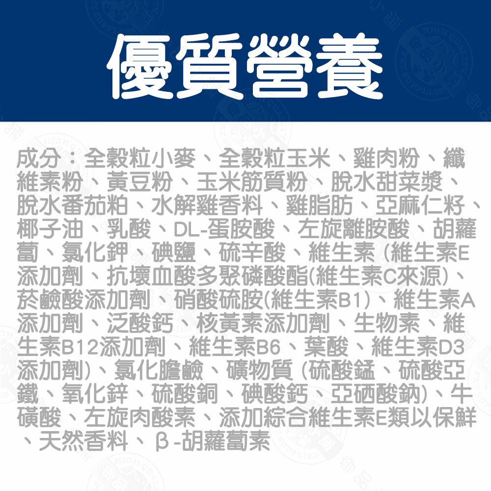 雞肉粉、全穀粒小麥、全穀粒玉米、黃豆粕、玉米筋質粉、黃豆粉、豌豆纖維、脫水甜菜漿、脫水番茄粕、雞肝香料、豬肉脂肪、亞麻仁籽、椰子油、豬肝香料、乳酸、纖維素粉、DL-蛋胺酸、左旋離胺酸、胡蘿蔔、碘鹽、維生素 (維生素E添加劑、抗壞血酸多聚磷酸酯(維生素C 來源)、菸鹼酸添加劑、維生素B1、泛酸鈣、維生素B6、維生素A添加劑、生物素、維生素B12添加劑、核黃素添加劑、葉酸、維生素D3添加劑)、硫辛酸、氯化鉀、氯化膽鹼、礦物質 (硫酸錳、硫酸亞鐵、氧化鋅、硫酸銅、碘酸鈣、亞硒酸鈉)、牛磺酸、添加綜合維生素E類以保鮮、左旋肉酸素、天然香料、β-胡蘿蔔素