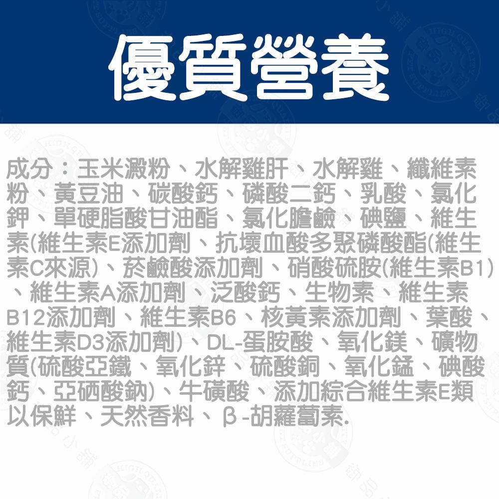 玉米澱粉、水解雞肝、黃豆油、纖維素粉、碳酸鈣、磷酸二鈣、乳酸、單硬脂酸甘油酯、氯化鉀、碘鹽、氯化膽鹼、DL-蛋胺酸、維生素(維生素E添加劑、抗壞血酸多聚磷酸酯(維生素C來源)、菸鹼酸添加劑、維生素B1、維生素A添加劑、泛酸鈣、生物素、維生素B12添加劑、維生素B6、核黃素添加劑、葉酸、維生素D3添加劑)、礦物質(硫酸亞鐵、氧化鋅、硫酸銅、氧化錳、碘酸鈣、亞硒酸鈉)、牛磺酸、添加綜合維生素E及檸檬酸以保鮮、天然香料、β-胡蘿蔔素。