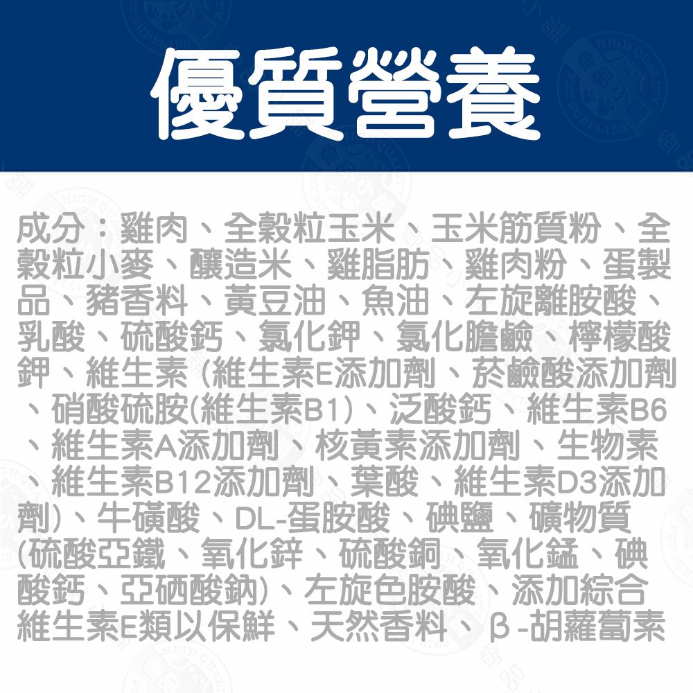 釀造米、玉米筋質粉、雞肉副產品粉、豬脂肪(以混合維生素E及檸檬酸保存)、雞肉、雞肝香料、乳酸、魚油、氯化膽鹼、氯化鉀、硫酸鈣、維生素E添加劑、碘鹽、檸檬酸鉀、蛋氨酸、維生素(維生素E添加劑、菸鹼酸、維生素B1、維生素B6、泛酸鈣、核黃素、生物素、維生素B12添加劑、維生素A添加劑、葉酸、維生素D3添加劑)、牛磺酸、 礦物質(硫酸亞鐵、氧化鋅、硫酸銅、氧化錳、碘酸鈣、亞硒酸鈉)、以混合維生素E及檸檬酸保存、磷酸、天然香料、β-胡蘿蔔素。