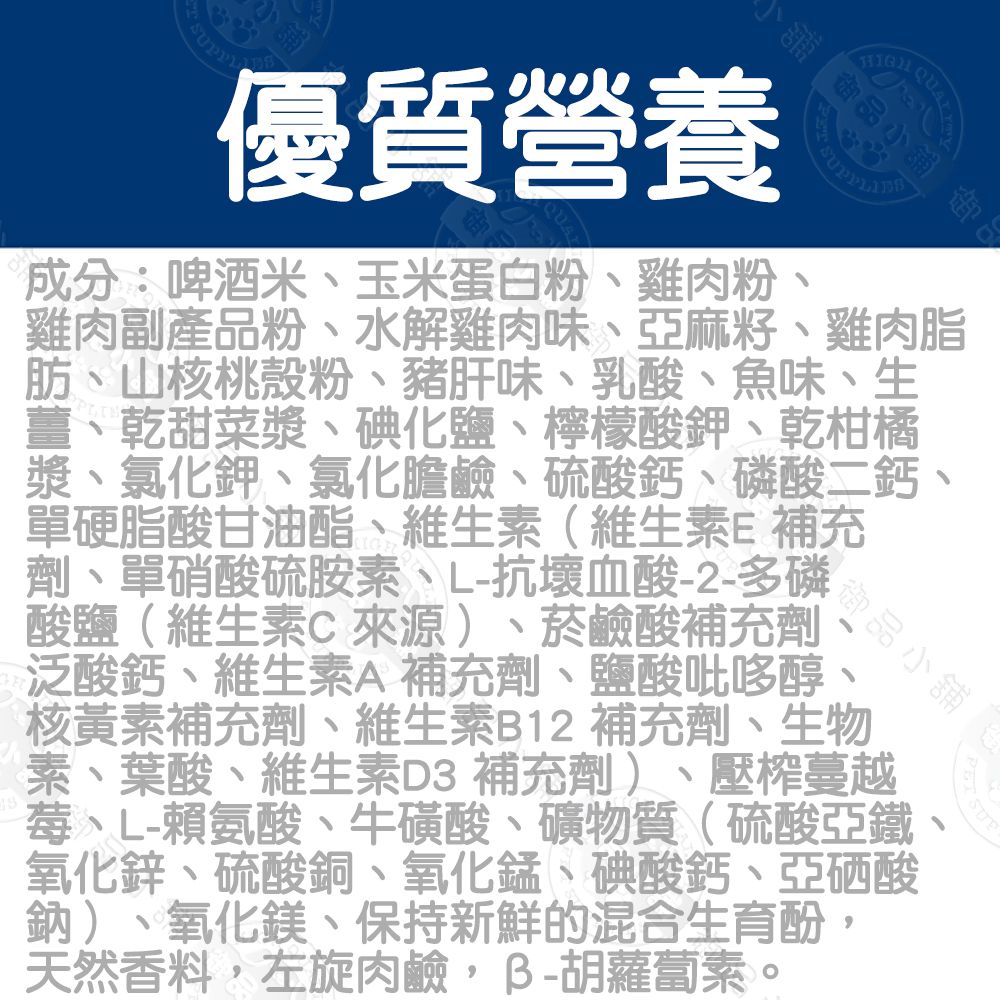 釀造米、玉米澱粉、玉米筋質粉、全穀粒小麥、雞肉副產品粉、亞麻仁籽、碎珍珠大麥、全穀粒燕麥、脫水甜菜漿、雞肝香料、豬肉香料、乳酸、薑、黃豆油、磷酸二鈣、檸檬酸鉀、豬肉脂肪、氯化鉀、碘鹽、氯化膽鹼、左旋離胺酸、維生素(維生素E添加劑、抗壞血酸多聚磷酸酯(維生素C來源)、菸鹼酸添加劑、維生素B1、維生素A添加劑、泛酸鈣、維生素B12添加劑、維生素B6、核黃素添加劑、生物素、葉酸、維生素D3添加劑)、碳酸鈣、牛磺酸、礦物質(硫酸亞鐵、氧化鋅、硫酸銅、氧化錳、碘酸鈣、亞硒酸鈉)、左旋肉酸素、添加綜合維生素E及檸檬酸以保鮮、天然香料、β-胡蘿蔔素。