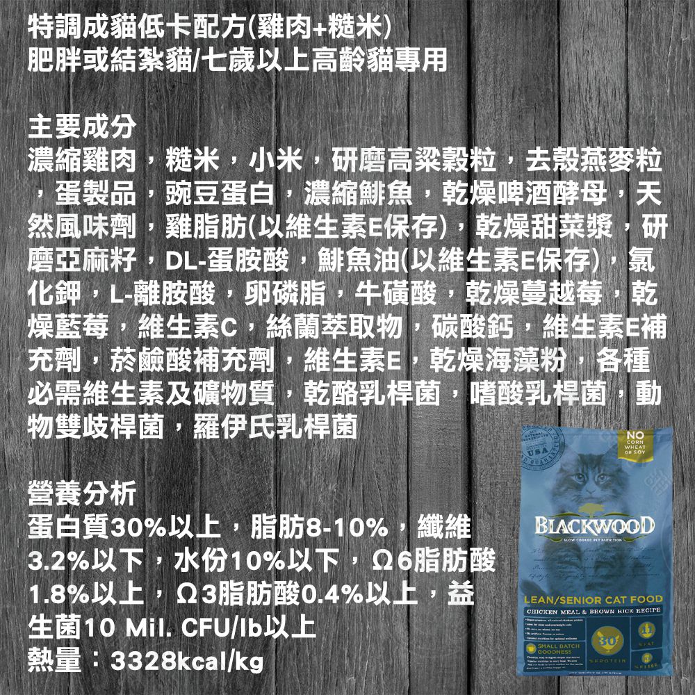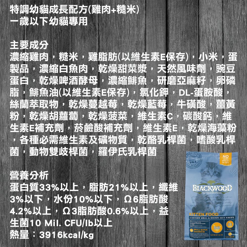 蛋白質33%以上,脂肪21%以上,纖維3%以下,水份10%以下,Ω6脂肪酸4.2%以上,Ω3脂肪酸0.6%以上,益生菌10 Mil. CFU/lb以上