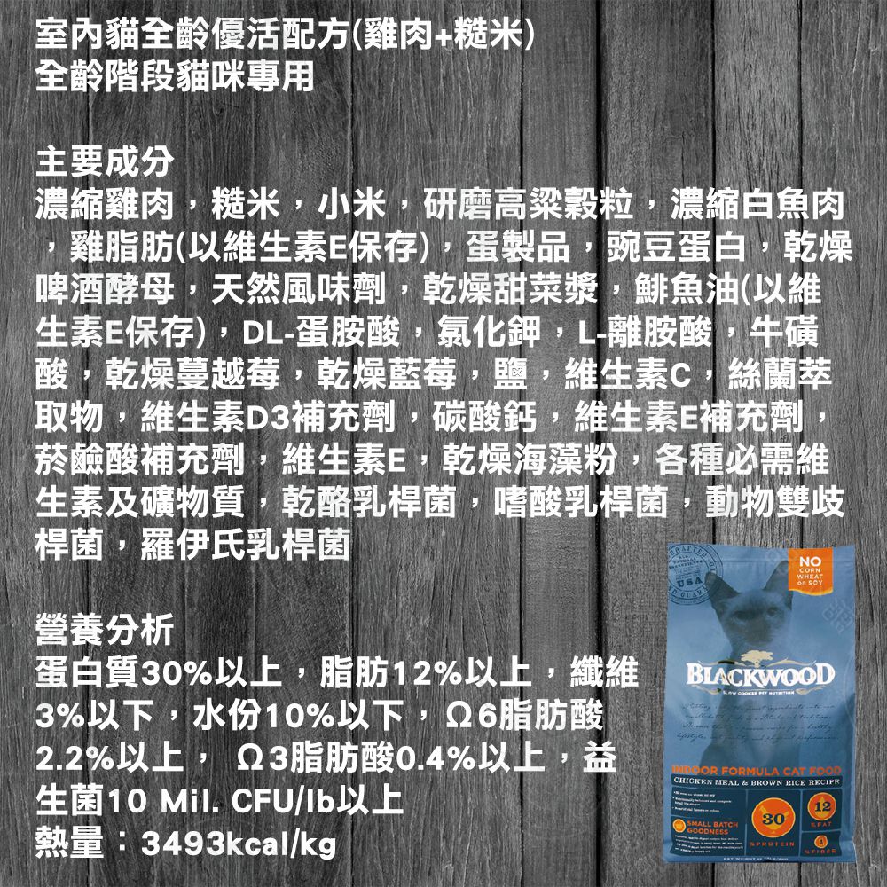 蛋白質30%以上,脂肪8-10%,纖維3.2%以下,水份10%以下,Ω6脂肪酸1.8%以上,Ω3脂肪酸0.4%以上,益生菌10 Mil. CFU/lb以上