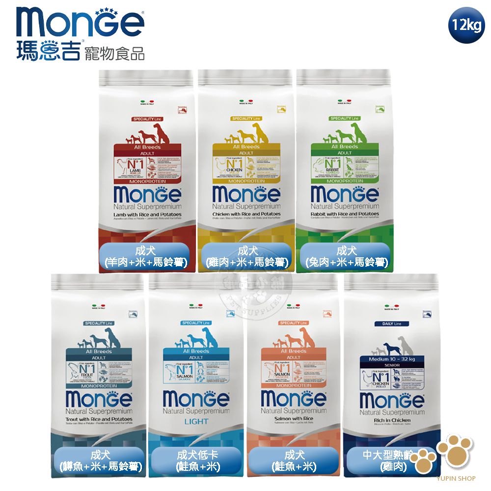 Monge瑪恩吉 天然呵護系列 成犬/中大型熟齡犬配方12kg 單一動物蛋白 低敏 益生元木寡糖 易消化 送贈品